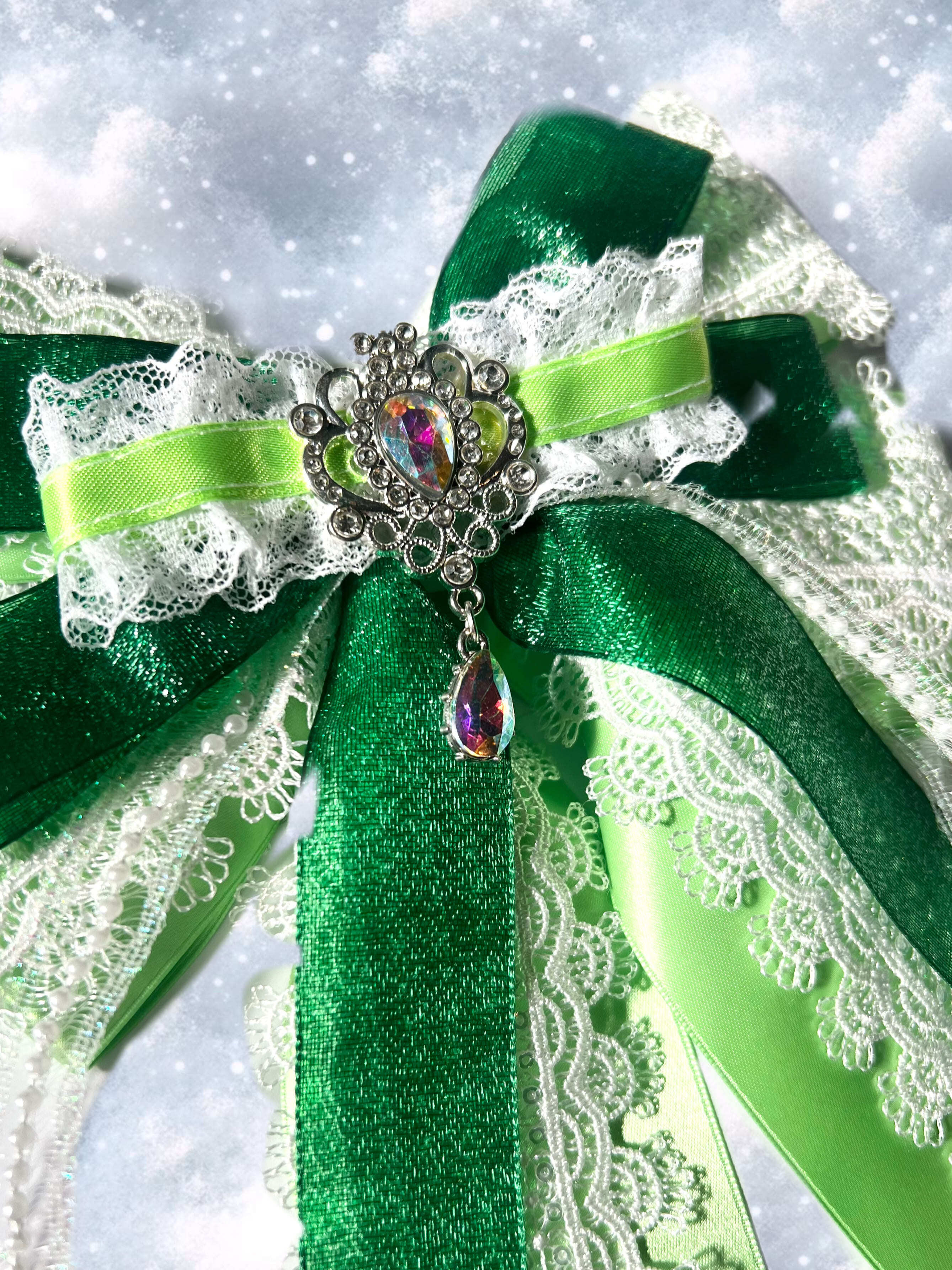 黄緑を基調に、ラメが輝くグリーンと、スパンコール付きの大型レースを贅沢に使った特別なリボンです♡